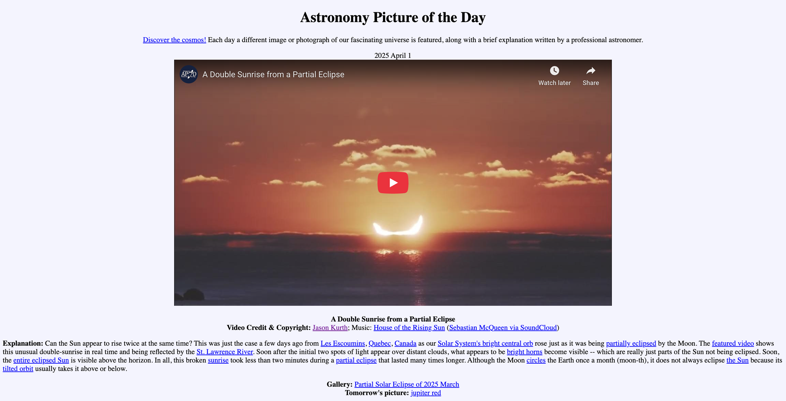 Jason Kurth 4/1/25 Jason Kurth 4/1/25 NASA APOD selected 4/1/2025 APOD 4/1/2025 Read More Jason Kurth 3/29/25 Jason Kurth 3/29/25 Eclipse photo featured on PetaPixel PetaPixel article Read More Jason Kurth 1/22/25 Jason Kurth 1/22/25 Jason’s Gallery exhibition featured in Westchester Magazine Read More Jason Kurth 1/14/25 Jason Kurth 1/14/25 Jason placed in two categories in Kolari Vision’s Life in Another Light photo competition Read More Jason Kurth 4/8/24 Jason Kurth 4/8/24 Jason was interviewed and featured on CBS news about his experience chasing the April 8, 2024 total solar eclipse Read More Jason Kurth 10/4/23 Jason Kurth 10/4/23 Annual eclipse featured on PetaPixel and My Modern Met Read More Jason Kurth 3/1/23 Jason Kurth 3/1/23 Jason was featured by the European Space Agency (ESA) Read More Jason Kurth 11/2/22 Jason Kurth 11/2/22 Jason was featured on The Photo Seen infrared photography podcast Read More